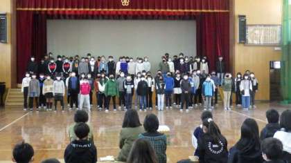 「6年生をおくる会」の最後は、6年生が発表しました。言葉と歌「旅立ちの日に」を発表して、卒業への思いを伝えました。