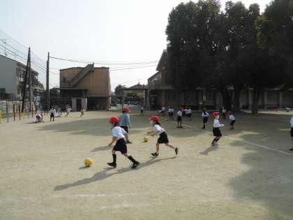 今、1年生は体育科「ボールけりゲーム」に取り組んでいます。今週は二人でパスをしながらシュートするゲームをしました。
