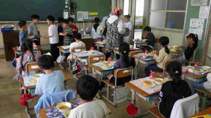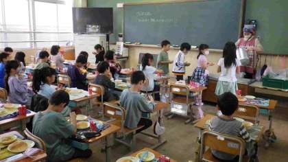 2年生の給食の様子です。たくさんの子どもたちがおかわりをしていました。