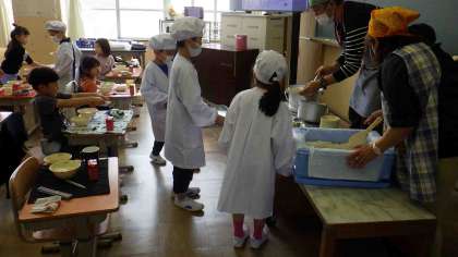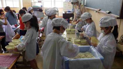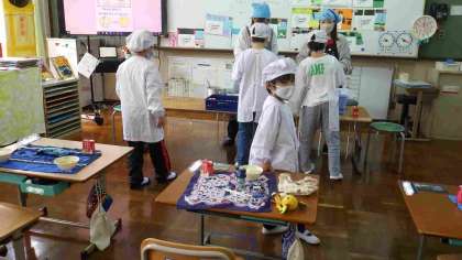 給食の配膳をしています。給食当番にやってもらう仕事を少しずつ増やしています。
