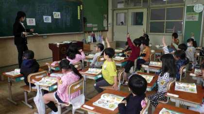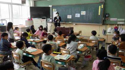 教科書の絵を見て、何をして、どのような話をしている場面なのか話し合っています。たくさんの子どもたちが発表していました。