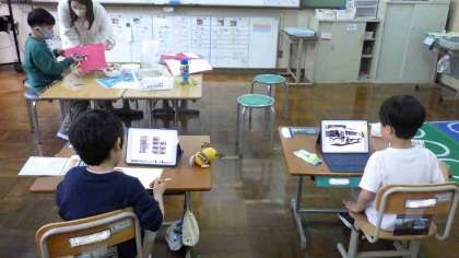 タブレットを使って乗り物について調べたり、調べたことを絵や言葉でかいたりしています。