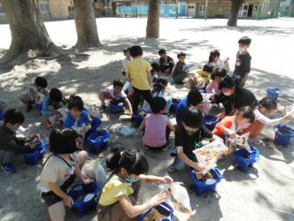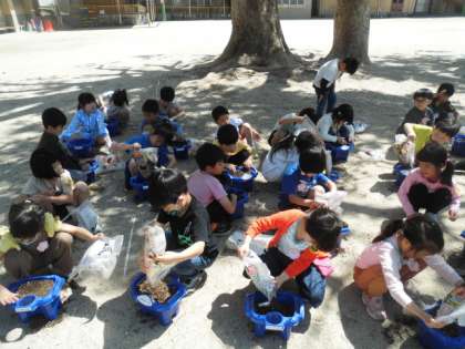 アサガオのたねをまくじゅんびをしました。プランターにつちをいれてならしました。つぎのじかんいよいよたねをまきます。「たのしにだな」「つちがふかふかきもちいい」とかんそうをはっぴょうしていました。