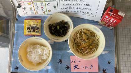 今日の給食カレンダーでは、「きつねカレーうどん」について紹介しました。
