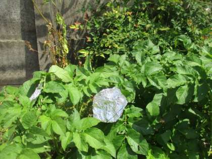 ジャガイモの葉にアルミ箔。