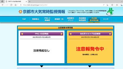 現在,京都市に光化学スモッグ注意報が発令されています。