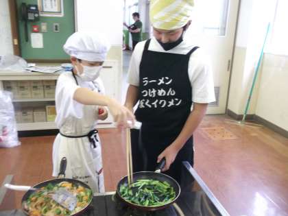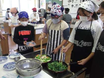 家庭科の学習で、いろどりいためと青菜の油いためをつくりました。