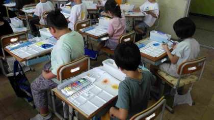 今日は絵の具セットの用具の使い方を知ったり、いろいろな濃さの色で線を描く学習をしてました。子どもたちはとてもうれしい様子で絵の具を使って描いていました。
