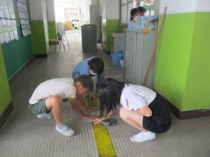 雑巾担当の子たちが,汚れを取ろうとみんなで必死に磨いています。