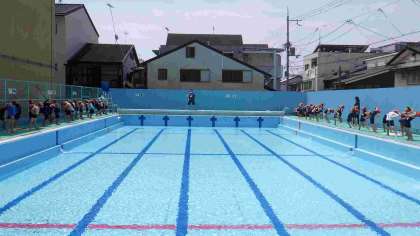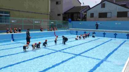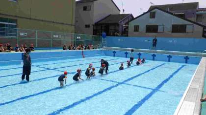水泳学習でのきまりを確認しながら学習をすすめました。準備体操をした後は、自分に水をかけたり、「カニ歩き」をしたりしました。