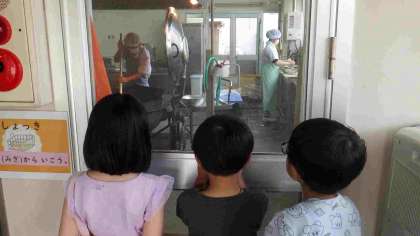今日は1年1組が給食室の見学に行きました。給食ホールから給食調理員さんの仕事の様子を見て、「おなべが大きいな。」「大きなしゃもじを使っているんだな。」「玉ねぎやじゃがいもがたくさんあるな。」「玉ねぎをとてもはやく切っていてすごい。」など、いろいろな発見をしていました。