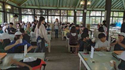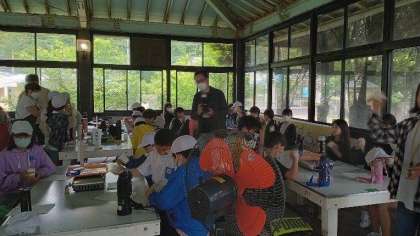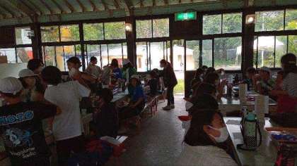 お弁当の後は、バターづくり体験です。カップに入った牛乳をまずはひたすら振り続けます。時間にして3分程度なのですが、結構疲れます。音がしなくなって、さらに振り続けるとバターができあがります。