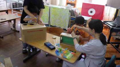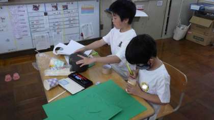 しいのみ学級では、お祝いをするために、いろいろな遊びの道具やかざりなどを楽しく作っています。