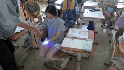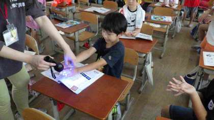 手洗いについて振り返る学習をしました。ブラックライトを使って、模擬の汚れを確かめると、指の間や爪、手首などの部分で洗い足りていないことがあることにびっくりしていました。毎日を健康に過ごすには、体の清潔を保つことなどが大切だと考えていました。