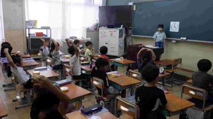 時計の模型の長針と短針で、「何時」や「何時半」の時刻を表す練習問題に取り組んでいます。