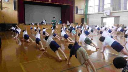 10月のスポーツ大会に向けて、6年生が集団演技の練習をしています。音楽に合わせて一人技の練習をしました。