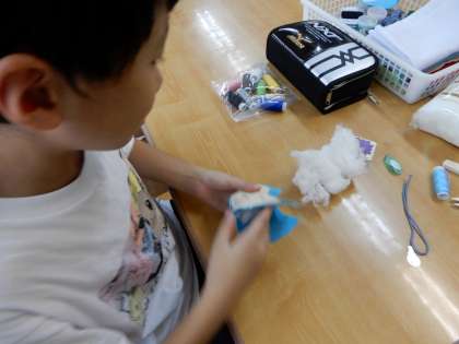 夏休み明けに、教室の棚の目隠し用カーテンを作った裁縫の活動から学習を発展させて、自立学習で好きなものをモチーフとしたマスコットづくりに取り組みました。