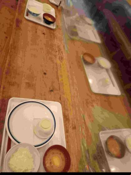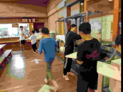 熱い味噌汁などは先生に置いてもらいます。その後、おかずを選んでとりにいきます。