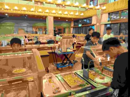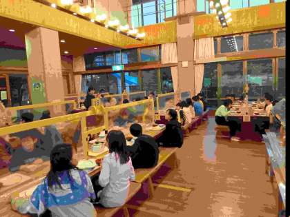 外は雨ですが、食堂内はとっても楽しそうです!お腹いっぱい食べています。