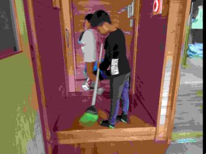 2日間宿泊した宿泊棟を掃除します。自分たちですすんで掃除を頑張っています!