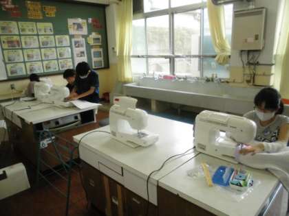 家庭科ではナップザックやトートバックを作っています。なれないミシンを使って作業をしています。手作りの大変について話しながら作業をしました。
