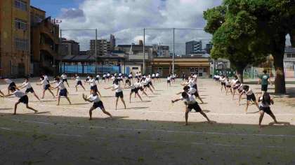 6年生が運動場でスポーツ大会の団体演技の練習をしました。今日は運動場で「ソーラン節」の練習をしました。