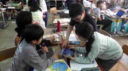校区の神社へインタビューへ行くために、聞きたいことを整理する学習をしています。ロイロノートのシンキングツールを使って、グループで内容を整理しています。