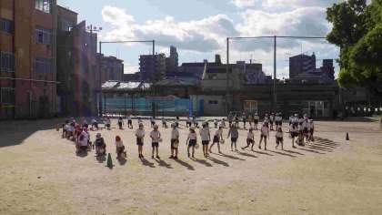 スポーツ大会の集団演技、エイサーの練習をしています。今日は運動場で練習しました。