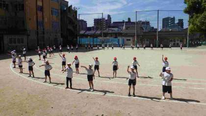 2年生がスポーツ大会の集団演技の練習をしています。今日は運動場で体系移動などの練習もしました。