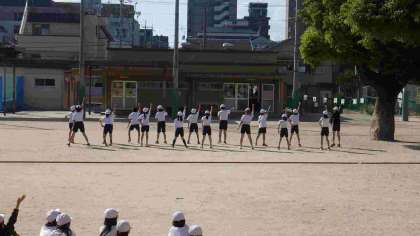 5年生はスポーツ大会で団体競技の綱引きを行います。綱引きの前には、各チーム自分たちで考えた踊りや言葉でアピールします。