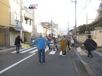 下校時,御前通にいつも保護者の方を中心とした見まもりボランティアの方が立って子どもたちの安全を見守ってくださっています。