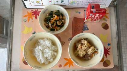 大豆は肉にくらべて、育てるのに必要なエネルギーや水の量が少ない食べ物です。今日の給食では、大豆から作られる高野どうふや油あげにくわえ、旬のしいたけを使っている「地球にやさしい献立」です。