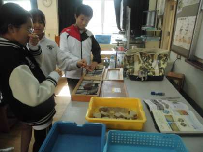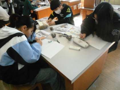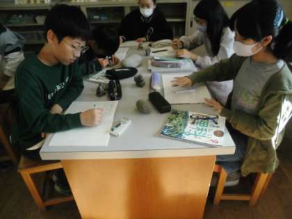 「礫岩・砂岩・泥岩」の観察をしました。火山の働きによっていろいろな岩石がつくられ、土地をつくり上げてきたことなどを発見しました。みんな興味津々に観察をすることができました。