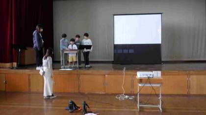 タブレットを使って作ったものを投影したり、がんばっていることを発表したりしています。