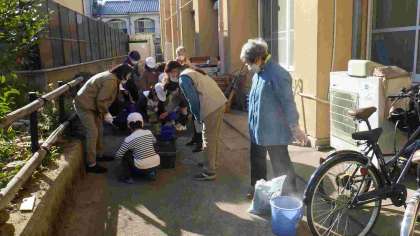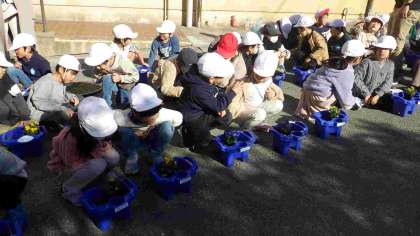 七条地域女性会の方に来ていただき、1年生が一人一鉢で球根と苗を植えました。