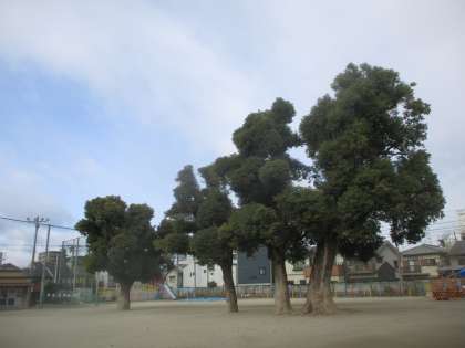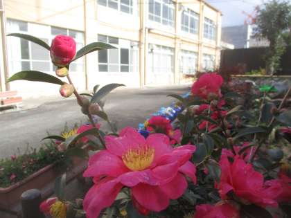 寒空の中、一年でかなり枝葉を伸ばしたクスノキと赤い花を咲かせたサザンカが美しい姿を見せています。