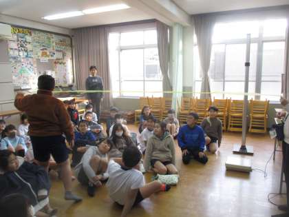 くしゃみや咳をしたときの飛沫の程度をひもをつかって説明してくださいました。