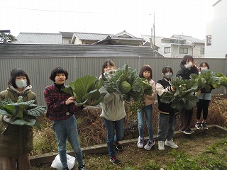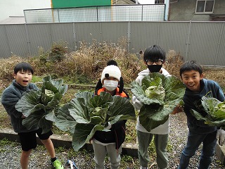 大切に育ててきたキャベツのしゅうかくをしました。大きな葉としっかり育った茎にみんなおどろいていました。家で何に調理しようかと楽しみに持返りました。また、葉をウサギやカモにもあげました。