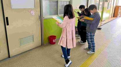校内で火事を防ぐものについて調べています。防火バケツや消火栓、火災警報器などを見つけて、教職員に質問していました。