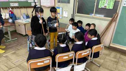 1年生が地域の幼稚園の年長児の皆さんを学校に招待して、交流会を行いました。来年度の入学を楽しみにしてくれるように、どんな学習をしているか、どんな教室があるかなどについて、グループで紹介しました。