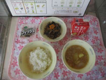 ◆ごはん ◆牛乳 ◆じゃがいものそぼろ煮 ◆ひじきの煮つけ ◆じゃこ です。