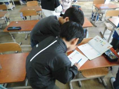 外国語活動の学習で、今日は友達とあいさつをした後に自分の好きなものを伝えあいました。聞いた事はメモを取りながら、たくさんの友だちとコミュニケーションをとりました。