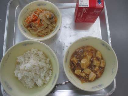 ◆むぎごはん ◆マーボ豆腐 ◆春雨の炒めもの ◆牛乳