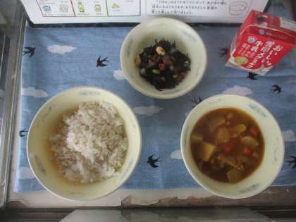 ◆むぎごはん ◆ポークカレー ◆ひじきのソテー ◆牛乳 です。