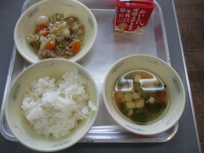 今日の献立は,◆ごはん ◆豆腐と青菜のスープ ◆うずらたまごとキャベツの炒め煮 ◆牛乳 です。