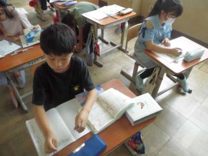 国語の学習でカンジーはかせの都道府県について学習しました。1人1つ自分の担当した都道府県の文章を読み、その後は漢字辞典を使って都道府県に使われている漢字の言葉集めをしました。漢字辞典の使い方にもずいぶん慣れてきました。