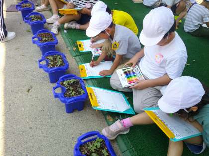 先週、種をまいたあさがおの観察をしました。