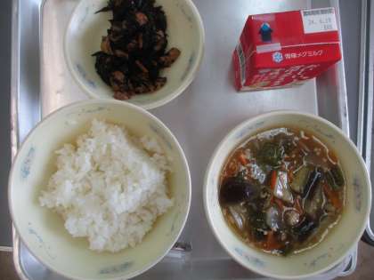今日の献立は,◆ごはん ◆ひじきの煮つけ ◆夏野菜のあんかけごはんの具 ◆牛乳 です。
