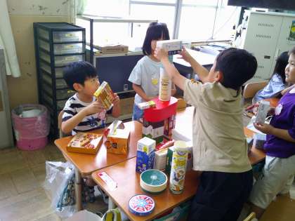 いろいろなかたちの箱や缶などを組み合わせて
