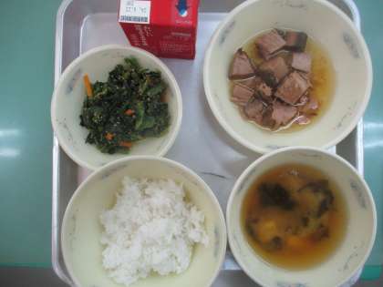 今日の献立は,◆ごはん ◆みょうがのみそ汁 ◆なまぶしのしょうが煮 ◆ほうれんそうのごま煮 ◆牛乳 です。